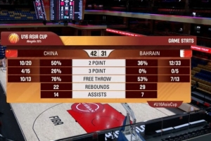 體育資訊9月5日訊 U16男籃亞洲杯1/4決賽,中國隊(duì)半場42-31領(lǐng)先巴林隊(duì)。