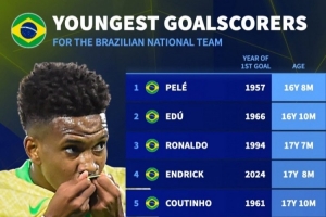 德轉(zhuǎn)列巴西隊史最年輕進球者: