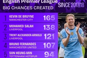 體育資訊9月7日訊 數(shù)據(jù)機構(gòu)squakwa統(tǒng)計了17-18賽季以來的英超創(chuàng)造重大機會情況,德布勞內(nèi)力壓薩拉赫居首。