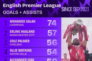 2023年9月以來(lái)英超參與進(jìn)球榜: