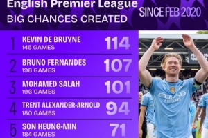 B費198場英超創(chuàng)造107次重大機會,同期僅次于114次的德布勞內(nèi)