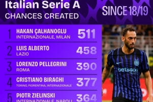 體育資訊9月7日訊 《轉(zhuǎn)會市場》統(tǒng)計了18-19賽季以來的意甲創(chuàng)造機會情況,恰爾汗奧盧獨自領(lǐng)跑。