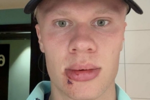 哈蘭德在今日通過(guò)社媒曬出自拍照,可以清洗看到嘴唇下的傷口,他對(duì)此解釋稱:“剛剛被公交車門給撞了??縫了三針??”