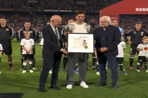 體育資訊9月8日訊 德國隊在本輪世預賽主場迎戰(zhàn)北愛爾蘭,主隊賽前為退役的老將胡梅爾斯舉辦了致敬儀式。