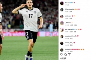 維爾茨也在賽后通過(guò)社媒曬出自己進(jìn)球后的單手捂耳朵慶祝照,并配文:“德國(guó)隊(duì)”。