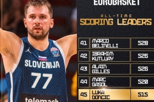 本場(chǎng)比賽過(guò)后,東契奇歐錦賽總得分來(lái)到515分,暫列歷史第45位,排在他前面的是馬克-加索爾;而歐錦賽的歷史得分王為保羅-加索爾(1183分)。