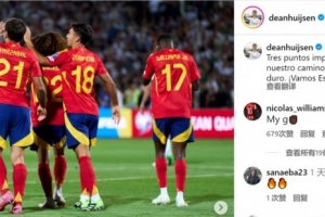 赫伊森社媒曬出比賽照片,配文:“開啟世預賽征程的重要三分,讓我們繼續(xù)努力,加油西班牙!”