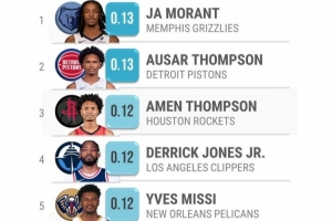美媒統(tǒng)計(jì)了上賽季球員滯空時(shí)間在上場時(shí)間中所占的比例,其中莫蘭特0.13%排名第一,奧薩爾-湯普森第二,阿門-湯普森第三,杰倫-格林第六,愛德華茲第七。