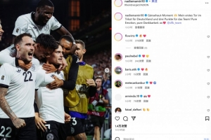 他也在賽后通過社媒曬出全隊(duì)的慶祝照,并配文:“真是讓人雞皮疙瘩都起來了??我身披德國隊(duì)?wèi)?zhàn)袍的首粒進(jìn)球,為球隊(duì)贏下了三分!無比激動(dòng),無比感恩。”