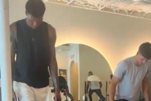 小賈巴里-史密斯、謝潑德、杰夫-格林一同練瑜伽,練習(xí)柔韌度平衡感和呼吸。