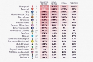 opta預(yù)測本賽季歐冠奪冠概率: