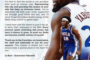 “親愛的費(fèi)城,經(jīng)歷了如此密集的一年后,要說再見真的很難。能夠代表這座城市,為你們而戰(zhàn)度過這個(gè)賽季,是無上的榮耀。你們張開雙臂歡迎我,在順境與逆境中都支持我,我永遠(yuǎn)不會(huì)忘記每個(gè)比賽之夜,我們主場(chǎng)那難以言喻的能量。