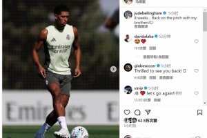 貝林厄姆社媒曬出訓(xùn)練照片,配文:“(缺席)8周,終于回到球場(chǎng)與我的兄弟們?cè)谝黄稹!?/p>