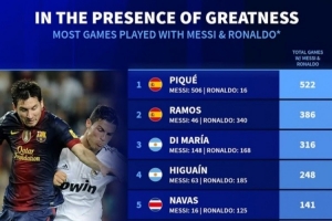 1.皮克,與梅西同場(chǎng)506次,與C羅同場(chǎng)16次,合計(jì)522次