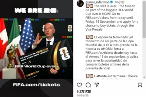 體育資訊9月11日訊 國際足聯(lián)主席因凡蒂諾更新社媒動(dòng)態(tài),宣布世界杯球票銷售即將開始。