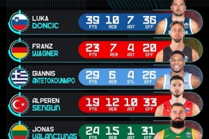 歐錦賽官推曬8強戰(zhàn)球員高光:東契奇39+10+7 字母哥29分 申京三雙