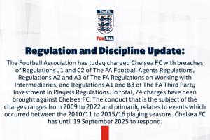 英格蘭足球總會今日對切爾西足球俱樂部提出指控,其違反《英足總足球經(jīng)紀人條例》J1和C2條款、《英足總中介合作條例》A2和A3條款,以及《英足總第三方球員投資條例》A1和B3條款。切爾西俱樂部共面臨74項指控,涉及2009年至2022年期間的違規(guī)行為,主要集中于2010/11至2015/16賽季期間。切爾西俱樂部需于2025年9月19日前就此作出回應(yīng)。