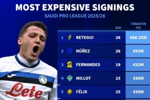 體育資訊9月12日訊 沙特今夏轉(zhuǎn)會窗已經(jīng)關(guān)閉,《轉(zhuǎn)會市場》也統(tǒng)計了沙特今夏最貴引援榜,雷特吉居首,5人年齡不高于23歲。