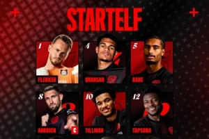 勒沃庫森首發(fā):1-弗萊肯、4-寬薩、5-巴代、8-安德里希、10-蒂爾曼、12-塔普索巴、14-???、20-格里馬爾多、21-巴斯克斯、23-內森-泰拉、25-帕拉西奧斯