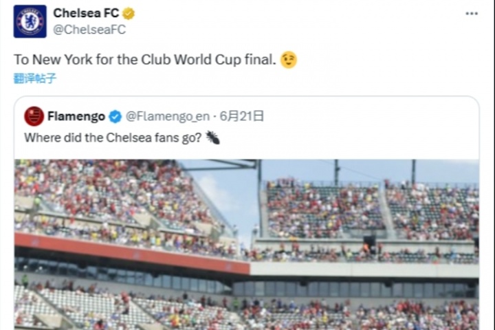 弗拉門(mén)戈小組賽3-戰(zhàn)勝切爾西,當(dāng)時(shí)他們球隊(duì)社媒曬照嘲諷:“切爾西球迷們要去哪?”切爾西今天也在社媒轉(zhuǎn)發(fā)回應(yīng):“去紐約參加世俱杯決賽???!?/p>