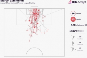 據(jù)統(tǒng)計(jì),這是蘇維門(mén)迪在頂級(jí)聯(lián)賽生涯首次打進(jìn)禁區(qū)外的遠(yuǎn)射,他在為皇家社會(huì)和阿森納效力的比賽中94次射門(mén)打進(jìn)10球,但是首次打進(jìn)遠(yuǎn)射。