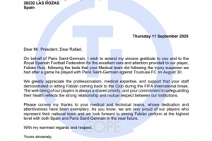 信中寫道:“尊敬的主席先生,親愛的拉斐爾:我謹代表巴黎圣日耳曼俱樂部,向您以及西班牙皇家足球協(xié)會致以誠摯的感謝,感謝您們對我俱樂部球員法比安-魯伊斯的細心照料和周到關懷。此前,在我們懷疑法比安在8月30日對陣圖盧茲的比賽中受傷后,貴方醫(yī)療團隊對他進行了檢查。”