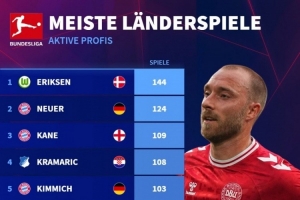 體育資訊9月14日訊 德國轉(zhuǎn)會(huì)市場列出了德甲現(xiàn)役球員國家隊(duì)出場次數(shù)榜,埃里克森144場居首,諾伊爾、凱恩二三位。