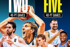 據(jù)Clutchpoints統(tǒng)計(jì),1997年到2017年的10屆歐錦賽,僅出現(xiàn)過兩次40+,23歲的諾維茨基在2001年歐錦賽銅牌戰(zhàn)中爆砍43分,35歲的保羅-加索爾在2015年歐錦賽半決賽中砍下40分。最近兩屆歐錦賽(2022和2025),已經(jīng)出現(xiàn)5次40+,東契奇2022年對(duì)陣法國砍47分,今年對(duì)陣意大利砍42分,字母哥2022年對(duì)陣烏克蘭砍下41分,馬爾卡寧2022年對(duì)陣克羅地亞砍下43分,今年對(duì)陣英國砍43分。