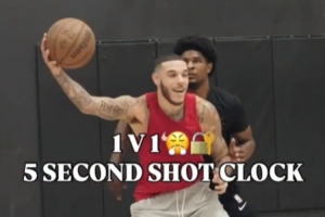 訓(xùn)練師曬騎士后衛(wèi)朗佐-鮑爾、開拓者后衛(wèi)斯庫特-亨德森,以及另一位職業(yè)球員Milan Acquaah的單挑訓(xùn)練視頻,進攻時間限時5秒。