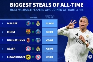 體育資訊7月10日訊 《轉(zhuǎn)會(huì)市場(chǎng)》統(tǒng)計(jì)了歷史自由身離隊(duì)身價(jià)榜,姆巴佩以1.8億歐元居首。