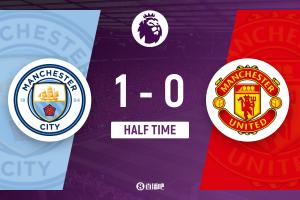 上半場補時1分鐘,曼城1-0曼聯(lián)。