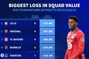 體育資訊7月10日訊 《轉(zhuǎn)會(huì)市場(chǎng)》統(tǒng)計(jì)了今夏因?yàn)榍騿T自由身離隊(duì)而身價(jià)損失情況,里爾、阿森納、拜仁分列前三。