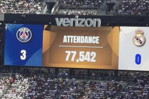 現(xiàn)場大屏幕顯示,本場比賽現(xiàn)場觀戰(zhàn)的球迷人數(shù)達到77542人。