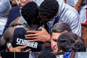 比賽賽后,同時入選最佳陣容的字母哥和施羅德?lián)肀е乱?。對此,施羅德表示:“揚尼斯做出了非常棒的舉動,他主動來找我,說我們各自代表德國和希臘為國征戰(zhàn),而他這次也終于為希臘隊贏得了首枚大賽獎牌。我對他只有敬佩——他有四個可愛的孩子、賢惠的妻子,還有始終陪伴他的兄弟,一家人都在為籃球事業(yè)努力。更不用說他在NBA賽場上的表現(xiàn),那完全是另一個級別的存在,絕對是世界頂尖球員之一。他主動過來和我交流,這種舉動充滿了體育精神,非常難得。他還說一直在看我們球隊的YouTube視頻,我覺得這種跨國家的球員互動,對希臘和德國的籃球交流也很有意義。”