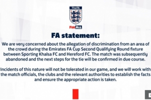 Sporting Khalsa隨后也發(fā)布了一份聲明,稱在對(duì)陣Hereford的足總杯比賽中,下半場(chǎng)發(fā)生了針對(duì)其守門員Ravan Constable的種族歧視言論。
