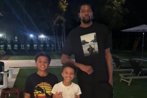 體育資訊09月15日訊 現(xiàn)火箭隊(duì)球探、前火箭球員DJ-奧古斯汀今日更新Instagram,曬出了自己倆兒子和杜蘭特的合影,并寫(xiě)道:“杜叔叔@杜蘭特。”
