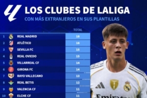 體育資訊9月16日訊 近年來(lái),皇馬引進(jìn)了多名外籍球員,這讓球隊(duì)中外籍球員比例不斷上升。根據(jù)德國(guó)轉(zhuǎn)會(huì)市場(chǎng)的統(tǒng)計(jì),皇馬陣中目前有18名外籍球員,占比高達(dá)72%(18/25),是西甲中外籍球員最多的俱樂(lè)部。