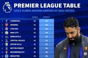 德轉(zhuǎn)列自阿莫林執(zhí)教曼聯(lián)以來各隊(duì)在英超取得的積分情況,阿莫林帶隊(duì)31輪僅取得31分,僅高于上賽季三支英超降級隊(duì),距第1名31輪取得68分的利物浦相差37分。