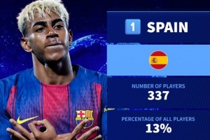 體育資訊9月16日訊 德國轉(zhuǎn)會市場統(tǒng)計了五大聯(lián)賽各國球員的數(shù)量,并列出榜單,西班牙337人居首。