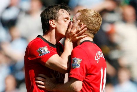 2010年4月,斯科爾斯在曼市德比最后時刻打入制勝球,幫助曼聯(lián)1-0取勝。進(jìn)球后,他和內(nèi)維爾在場上親吻,震驚全場。