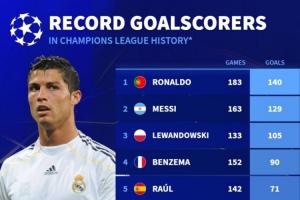 體育資訊09月16日訊 今夜,新賽季歐冠就將打響。德轉(zhuǎn)在賽前列出了歐冠歷史射手榜,C羅以140球位列榜首,梅西129位列第二,萊萬105球第三。