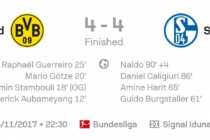 無獨(dú)有偶,多特曾在2017年11月的德甲第13輪魯爾德比上演“驚世名局”!再4-0領(lǐng)先的情況下,下半場遭沙爾克04連扳4球,最終同樣4-4戰(zhàn)平!