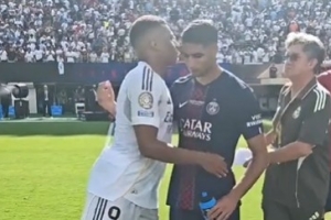 賽后,姆巴佩和巴黎前隊友阿什拉夫、貢薩洛-拉莫斯等人擁抱致意。