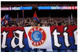 水晶宮球迷展示的橫幅將歐足聯(lián)標志中的歐洲地圖替換為歐元符號,并標有“UEFA MAFIA”(歐足聯(lián)黑手黨)字樣。