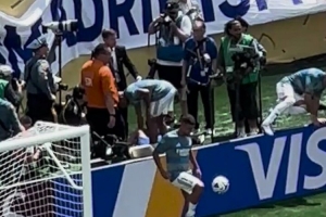 比賽開始之前,一名志愿者因高溫中暑,姆巴佩在場邊為其提供幫助。