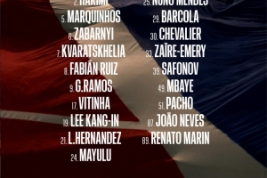 巴黎歐冠大名單:2-阿什拉夫、5-馬爾基尼奧斯、6-扎巴爾尼、7-克瓦拉茨赫利亞、8-法比安-魯伊斯、9-貢薩洛-拉莫斯、17-維蒂尼亞、18-李剛?cè)省?1-盧卡斯-埃爾南德斯、24-馬尤盧、25-努諾-門德斯、29-巴爾科拉、30-舍瓦利耶、33-小埃梅里、39-薩福諾夫、49-姆巴耶、51-帕喬、87-若昂-內(nèi)維斯、89-馬林