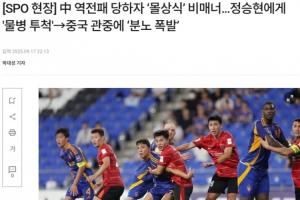 “被水瓶擊中的鄭升炫憤怒地向中國球迷提出抗議,正在熱身的李清龍上前制止避免沖突升級,但這一幕足以展現(xiàn)中國球迷的不文明?!?/p>