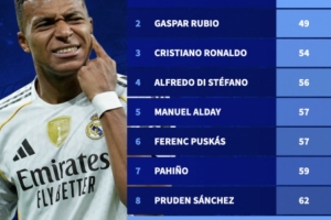姆巴佩打進(jìn)50球用了64場比賽,在皇馬隊(duì)史排名第9。