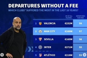 體育資訊7月10日訊 《轉會市場》統(tǒng)計了近10年來五大聯(lián)賽俱樂部的免簽離隊情況,瓦倫西亞59人最多。