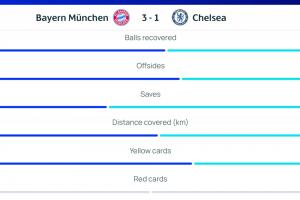 本場(chǎng)比賽拜仁全隊(duì)跑動(dòng)距離121.6km,切爾西112.5km,藍(lán)軍少跑了9.1km。